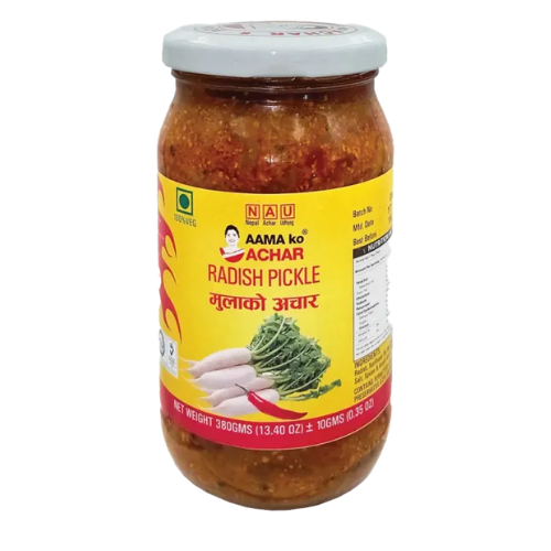 Aama Ko Plain Radish Pickle is a classic Nepali pickle made from fresh, tender radishes carefully preserved to capture their natural crunch and flavor. Lightly tangy and subtly spiced, this pickle enhances any meal with a gentle zing without overpowering the other dishes on your plate. Its clean, simple taste makes it perfect for pairing with rice, lentils, or traditional curries.
