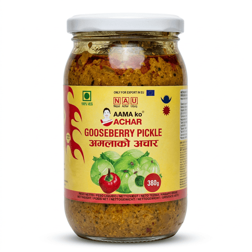 Gooseberry Pickle 380g by Aama Ko Achar is a traditional Nepali achar made from gooseberries (amla) blended with spices and oil. A tangy and flavorful pickle perfect with dal bhat, rice, and South Asian meals.