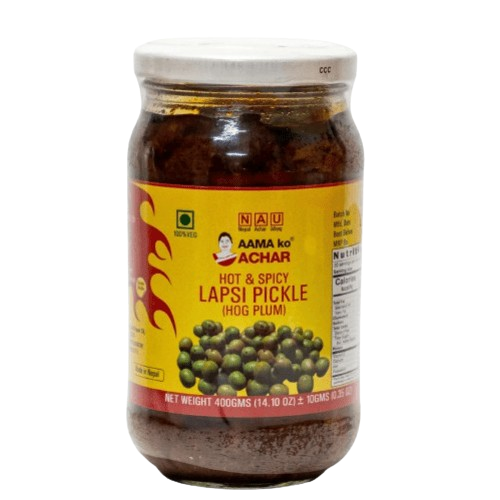 Hog Plum Pickle 380g – Hot & Spicy by Aama Ko Achar is a traditional Nepali lapsi achar made with hog plum and authentic spices. It delivers a bold tangy, sweet, and spicy flavor perfect with dal bhat, rice, and Nepali dishes.