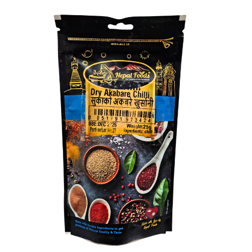 Nepali Food Dry Akabare Khursani 25g is premium quality dried red chili from Nepal, known for its fiery heat and authentic flavor. Perfect for adding spice to curries, pickles, sauces, and traditional Nepali and Indian dishes.